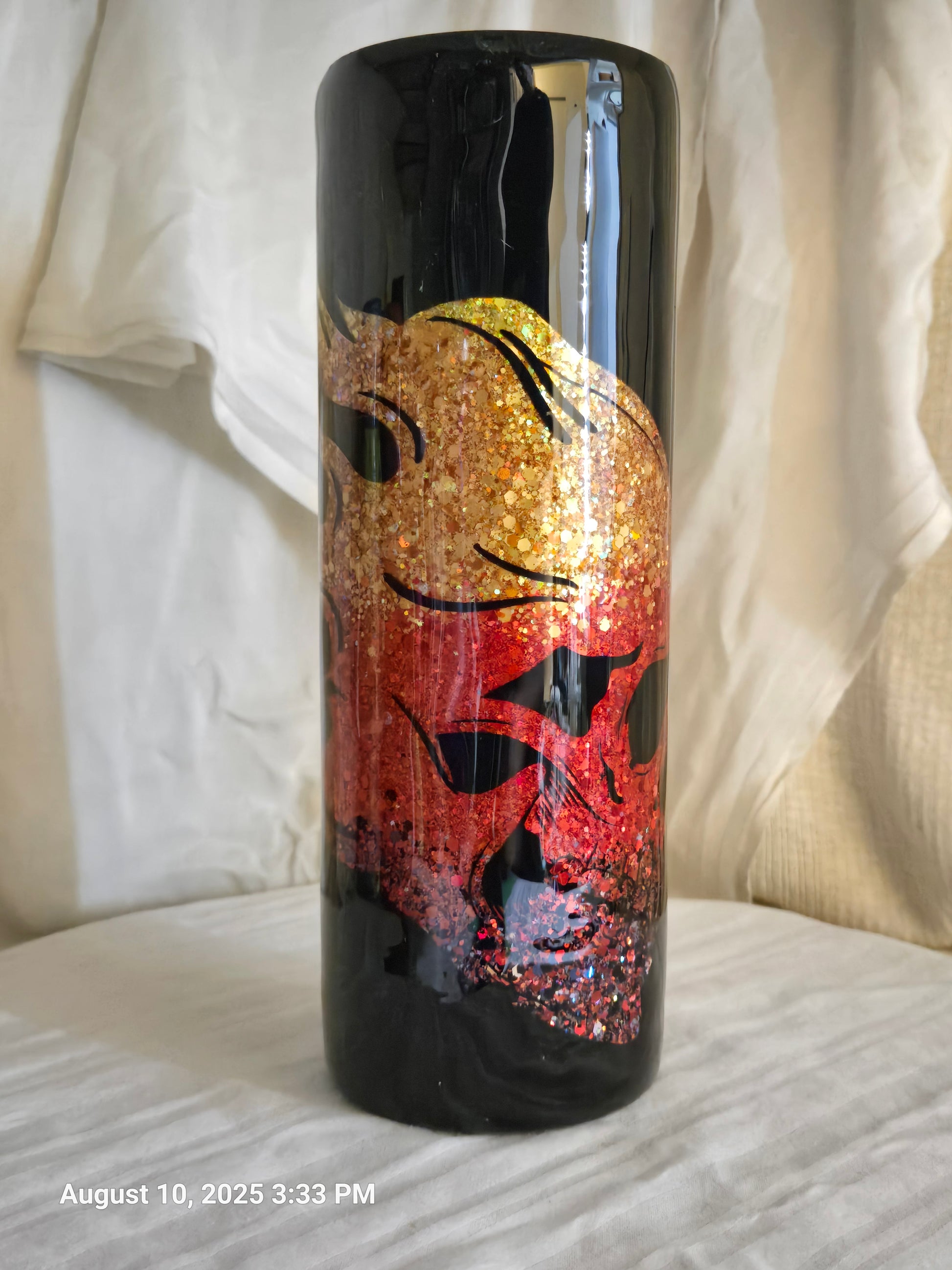 Wrapped nearly 360 degrees in a fierce burnthrough design, this 30oz tumbler brings the heat! Details: food grade epoxy, lid and straw included