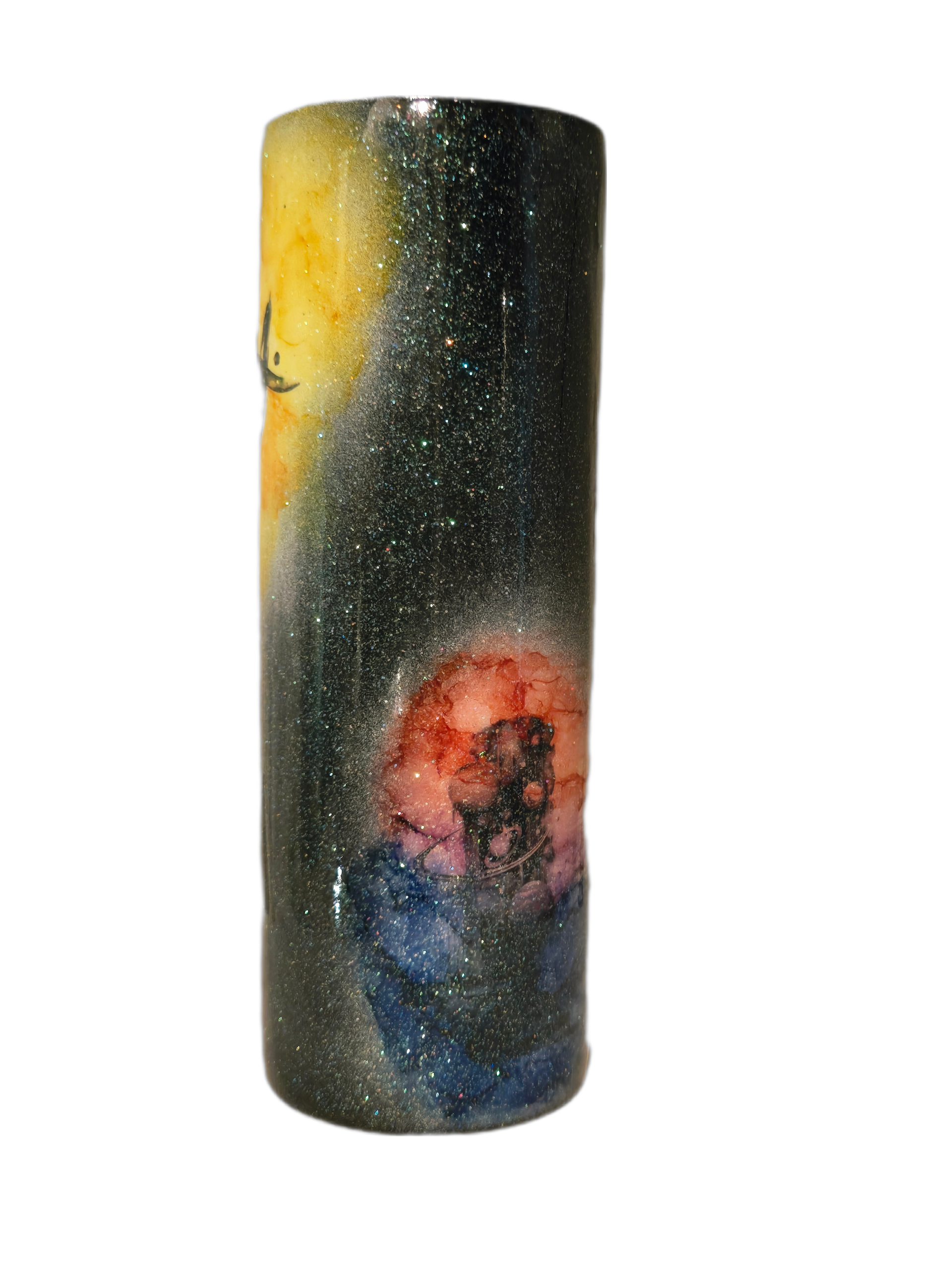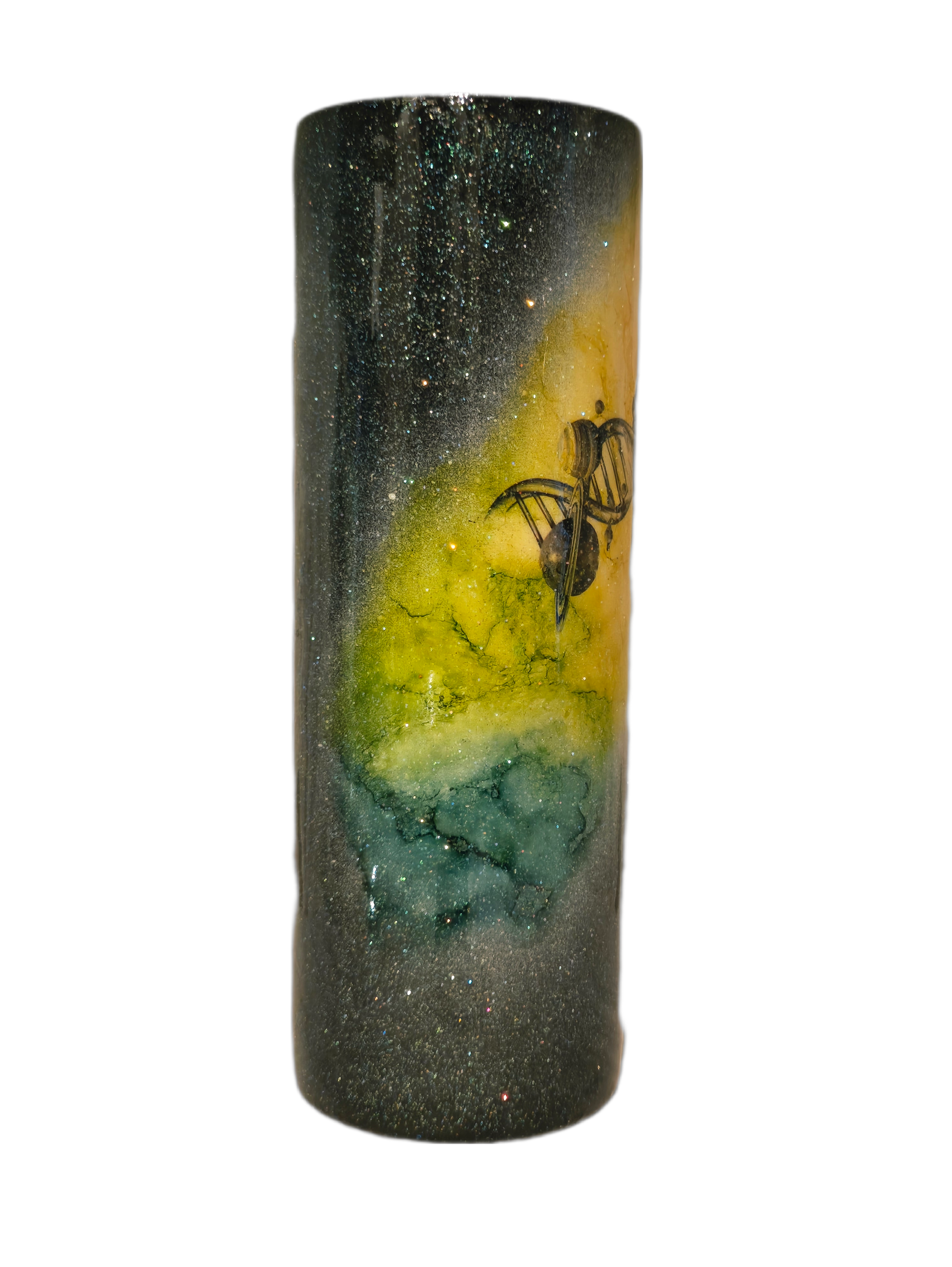 Handcrafted 20oz insulated tumbler. One side features a striking ant intertwined with a DNA helix, glowing against vibrant yellow and green cosmic colors. Flip it around, and you’ll discover a surreal staircase of planets in deep reds, purples, and blues — with a lone figure walking into the stars.