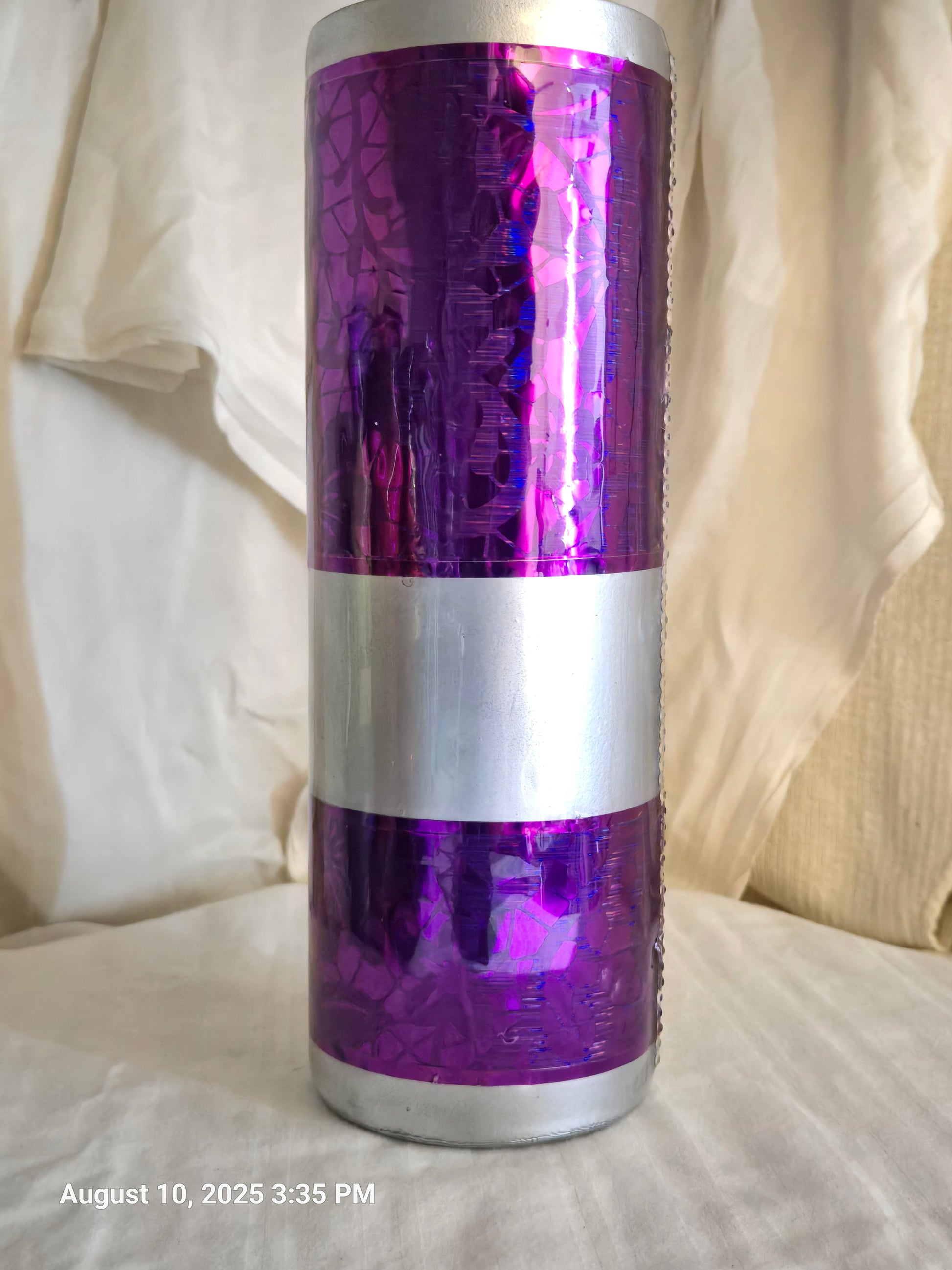 Meet La Veneno, the ultimate statement tumbler for those who blend bold elegance with a touch of vintage edge. This 30-ounce skinny insulated stainless steel tumbler features a sleek silver base framed by wide and narrow fuchsia-purple metallic bands — each intricately overlaid with holographic lace and floral weeding that catches the light like liquid art.