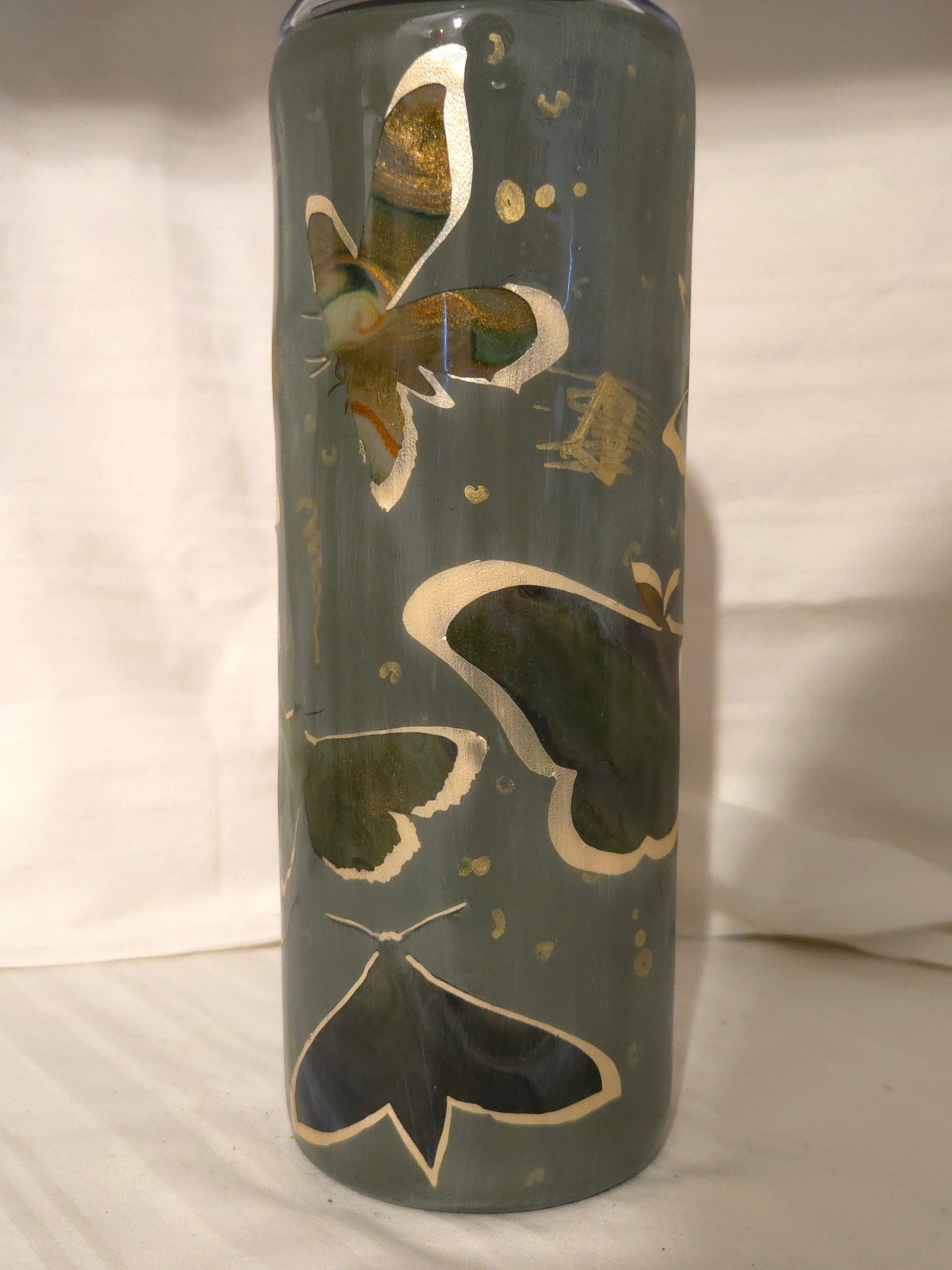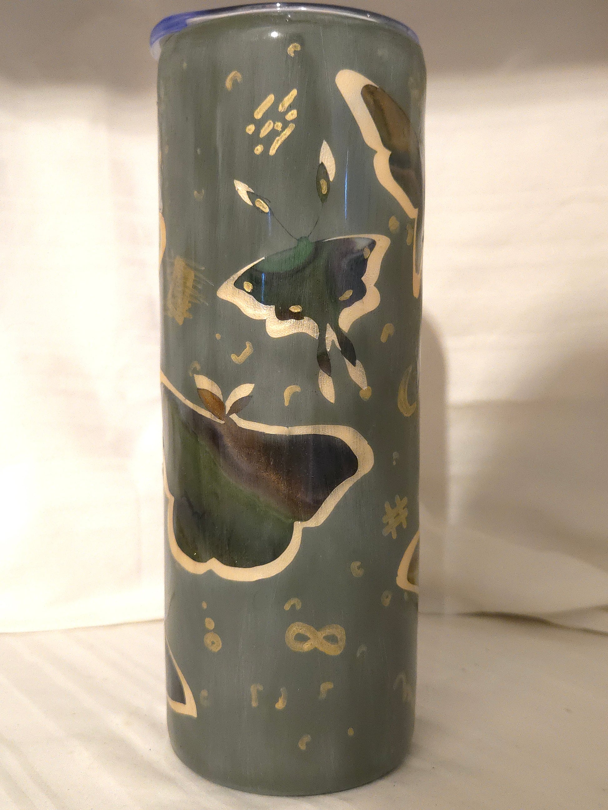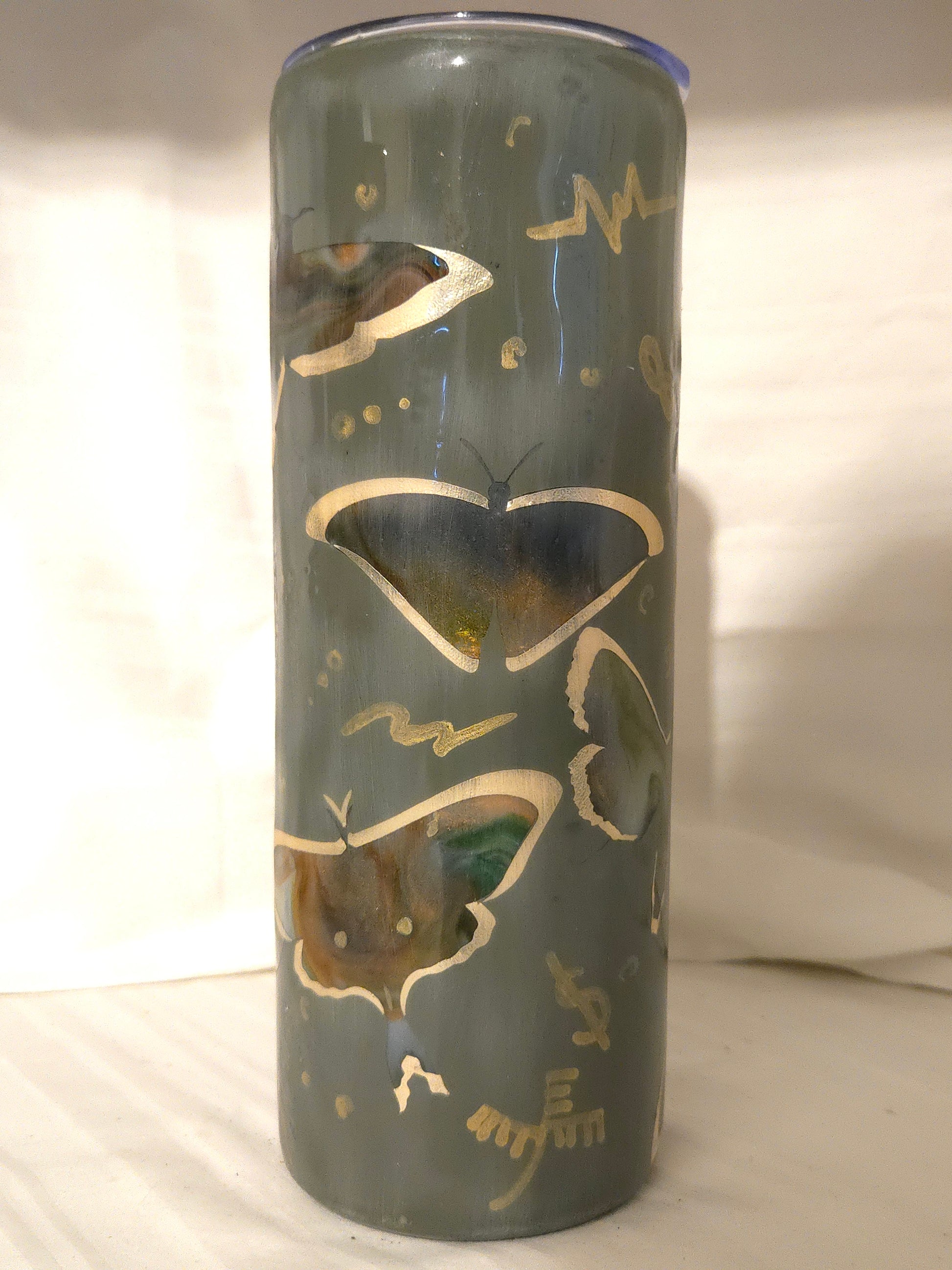 20oz insulated stainless steel tumbler. Veiled in a mossy green top coat with gold-outlined moths that reveal a subtle swirls of purple, green, gold, and orange underneath. Finished with playful gold doodles for a touch of attitude. 20oz stainless steel insulated tumbler