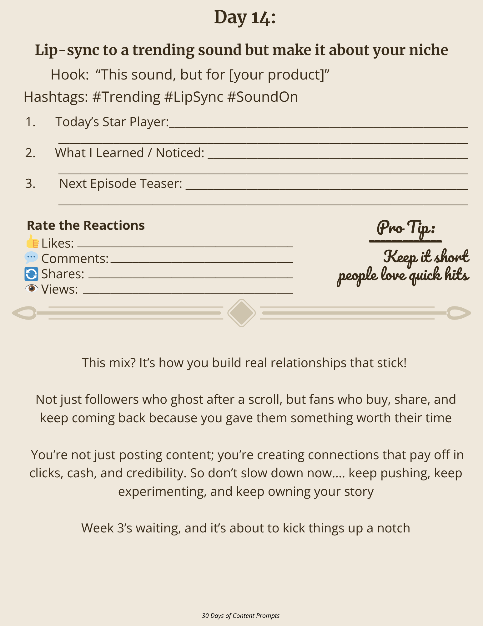 A full month of downloadable, proven content prompts designed to boost your game This guide delivers proven content prompts, pro tips, and hacks to skyrocket your views, followers, and sales. No fluff, just actionable steps