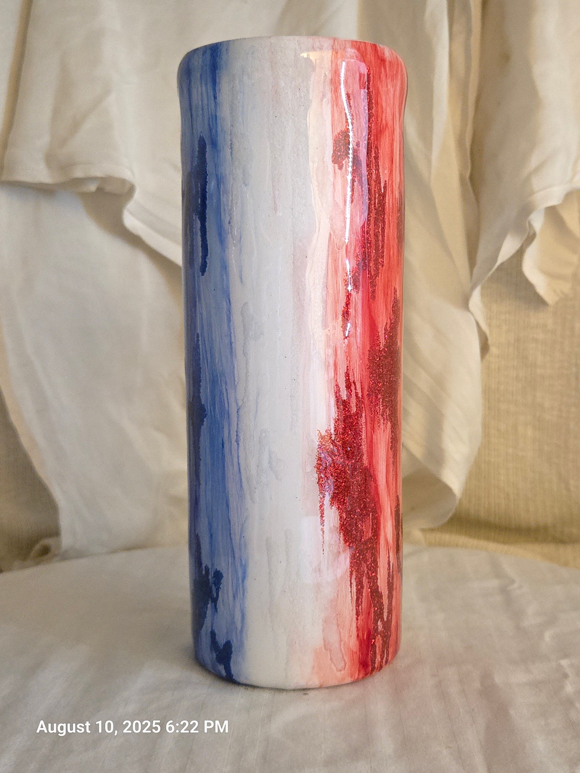 Turn heads with this 20oz insulated skinny tumbler featuring a bold red, white, and blue vertical blend with no harsh lines — just smooth, seamless color transitions. The rich red band is accented with jagged, crackle-style streaks highlighted in glitter for a shimmering, firework-like finish. Perfect for patriotic holidays, summer gatherings, or anyone who loves a little sparkle with their sip. Double-wall insulated to keep drinks hot or cold for hours, and built tough for everyday use.