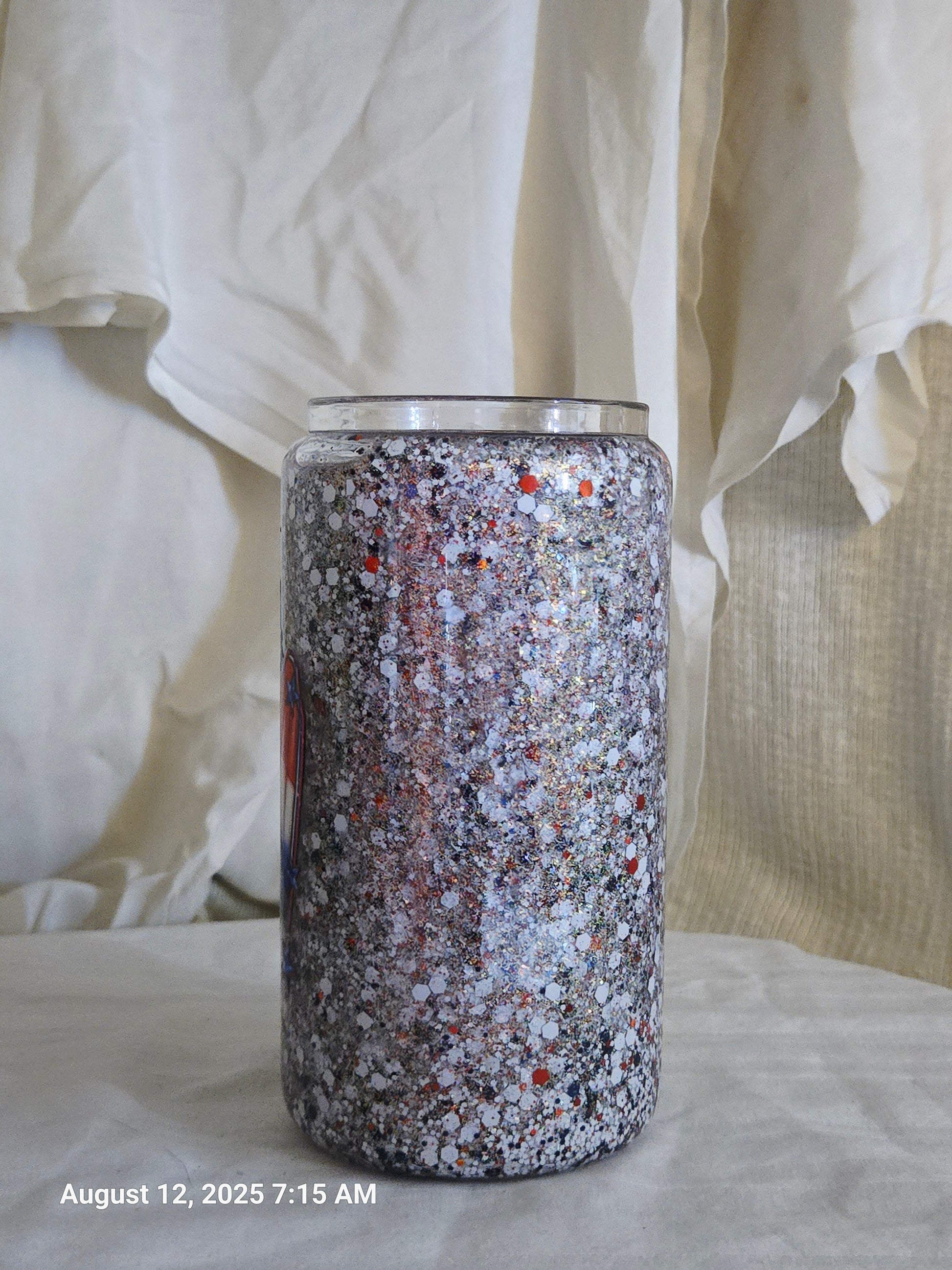 16oz glass snow globe tumbler with white glitter, red & blue accents, and a flag-striped ice cream decal flanked by patriotic popsicles built to steal the show