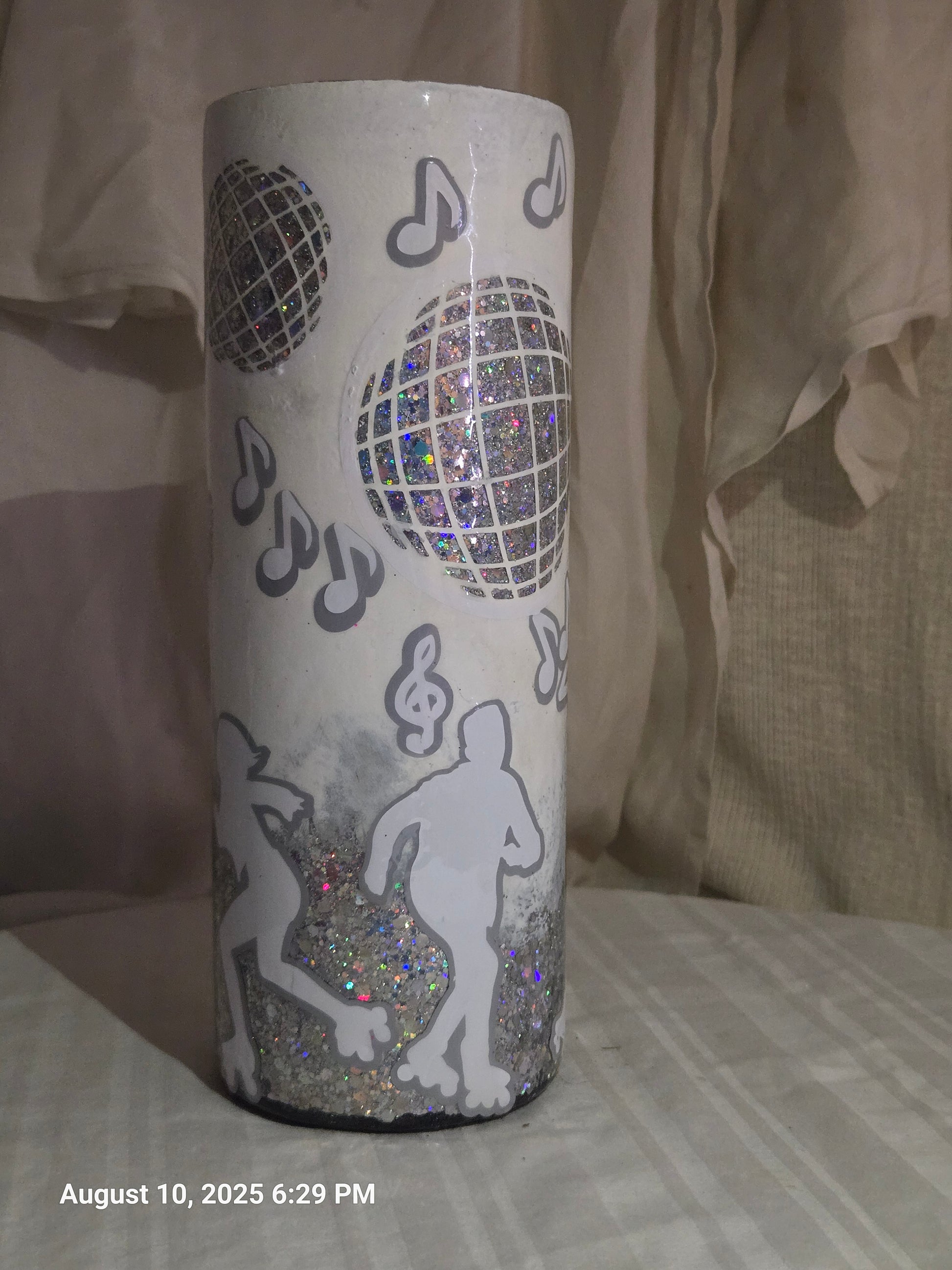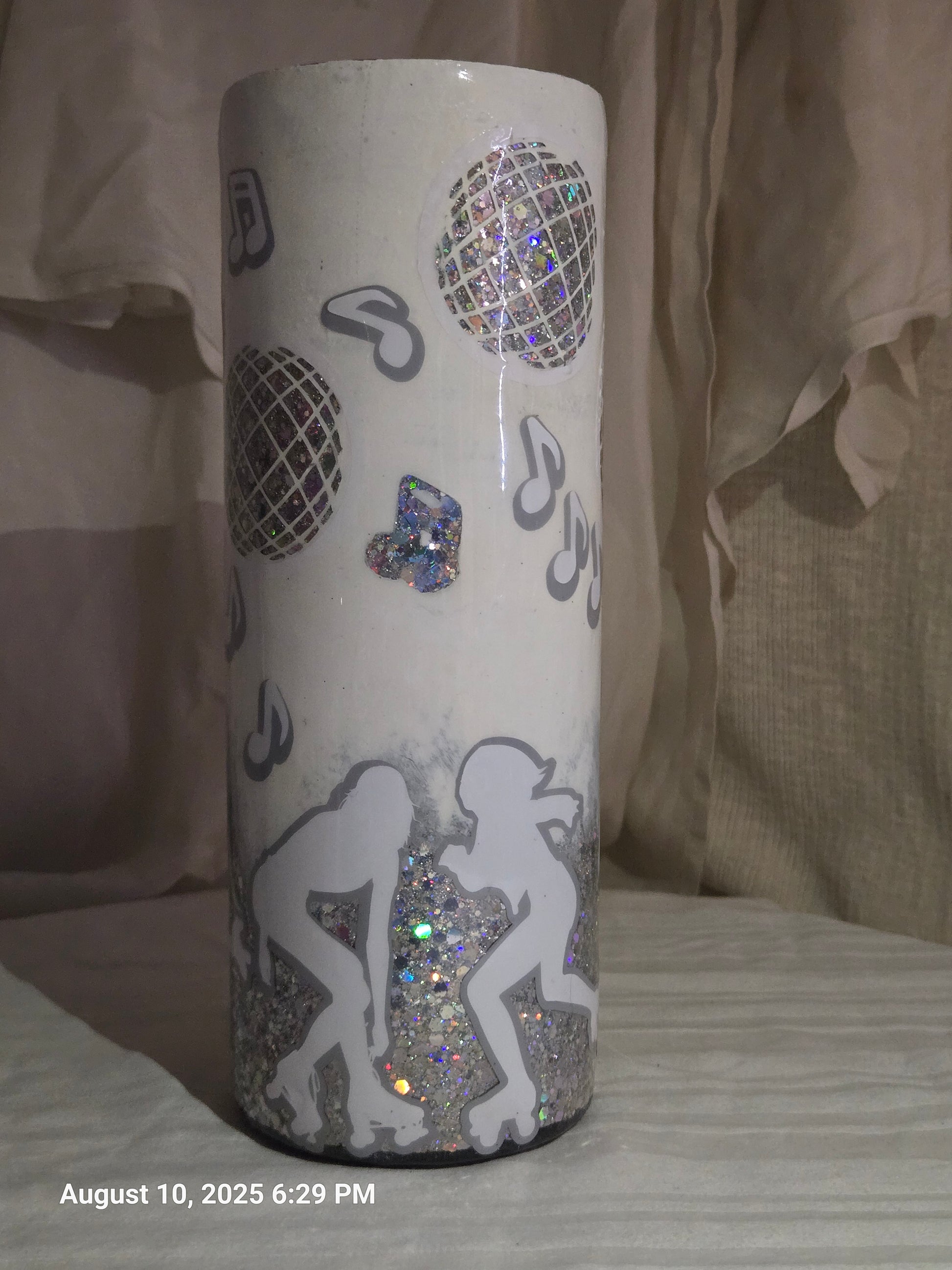 Get your groove on with this 20oz insulated skinny tumbler that’s pure disco derby vibes. The base shines with silver holographic glitter, catching light like a disco ball on steroids. The top half reveals a playful peekaboo of miniature disco balls and musical notes, fading smoothly down to reveal roller derby silhouettes skating into the spotlight.