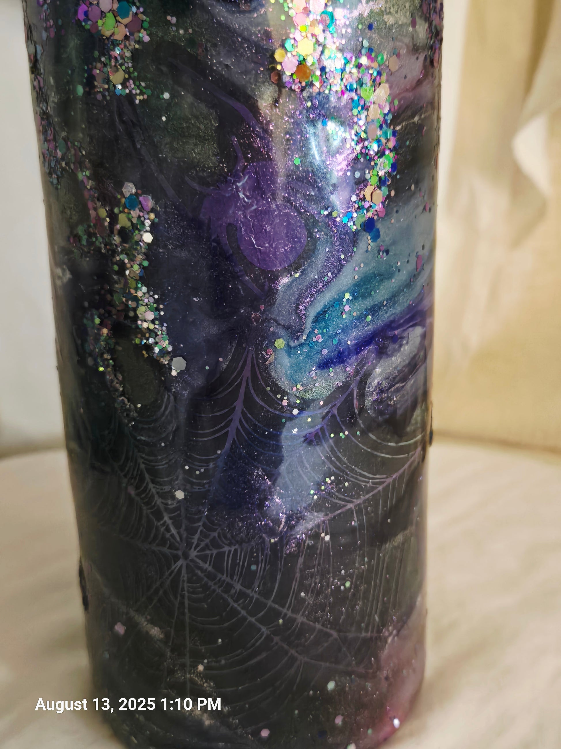 Get spooky in style with this 30oz insulated stainless steel tumbler, perfect for Halloween or any time you want a little mysterious flair. A black background sets the scene for vibrant spider webs and playful spiders in shades of blue, teal, and pink. Alcohol ink swirls and glitter weave in and around the webs, creating a mesmerizing, dynamic effect with every glance. Double-wall insulation keeps your drinks hot or cold for hours, while the durable stainless steel construction stands up to everyday use—or all-night Halloween parties. Ideal for fans of spooky-chic designs who love their beverages with a side of magic