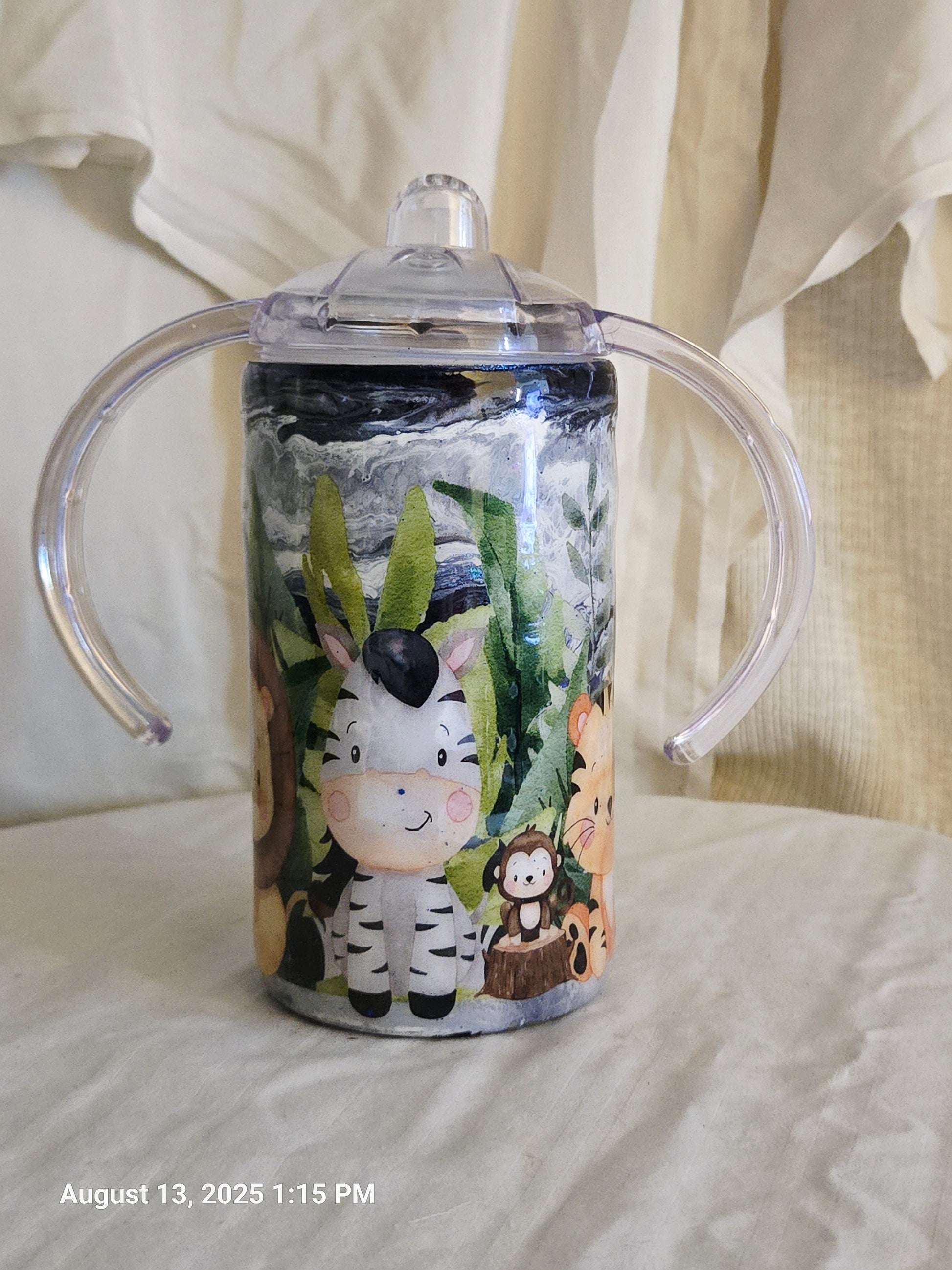 Meet the Zoo Crew! Your little one's12oz Sippy Sidekick that’s as versatile as it is fun. Featuring a sleek black, white, and silver alcohol ink swirl background, this tumbler comes alive with a wrap of playful zoo animals: monkeys, lions, zebras, giraffes, and more. Two lids make it perfect for any adventure - a sippy cup lid and a regular lid for bigger gulps. Double-wall insulation keeps drinks cold (or warm) for hours, while the durable stainless steel design stands up to daily use. Ideal for kids, animal lovers, or anyone who wants hydration with a wild side